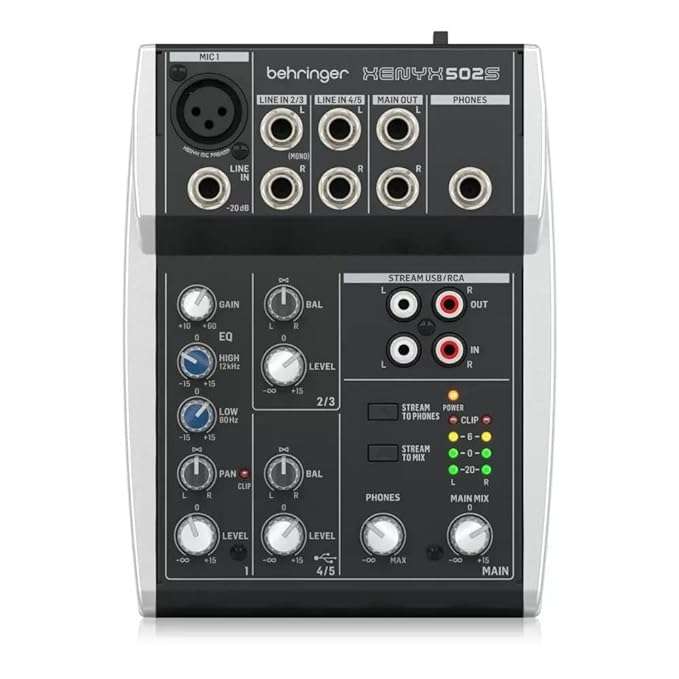 The Behringer Xenyx 502S Mixer delivers exceptional sound quality and performance. Equipped with five input channels, it provides versatility for various setups. Furthermore, the mixer features one Xenyx microphone preamp, ensuring crystal-clear audio. This preamp is designed for professional-level sound and is perfect for vocals. Additionally, the Xenyx 502S includes a 2-band EQ for precise frequency adjustments.