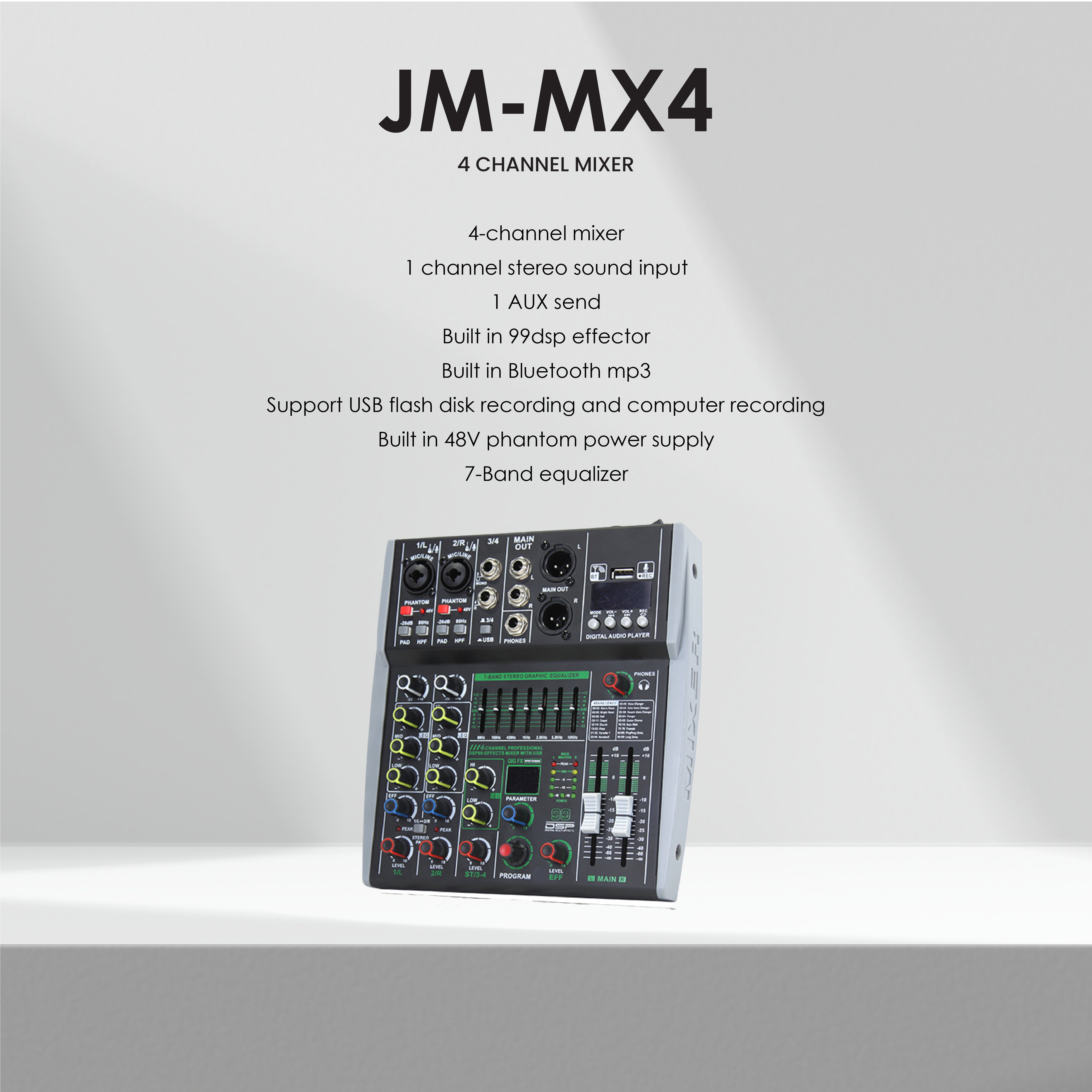Good for small PA systems, live mixing, karaoke, DJing, or home studio use given its features.