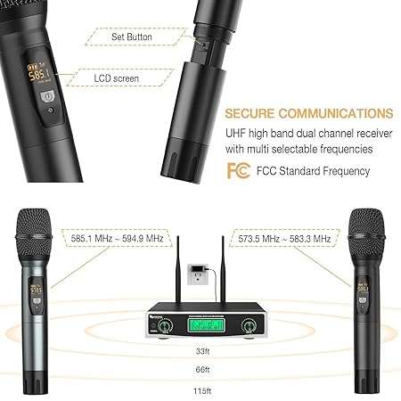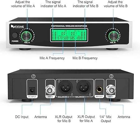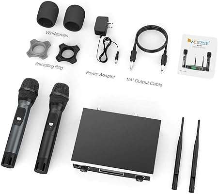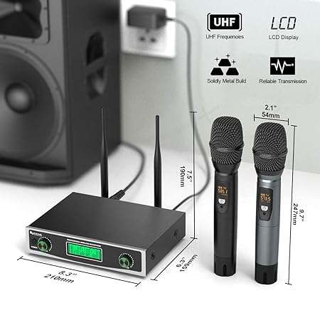 | Included Components | Portable Metal Receiver displays an easy to read unique identity, two handheld transmitters ( 2 x AA batteries (not included) are required for each mic), 1X 1/4″ output cable, bonus anti-rolling silicone ring. |
