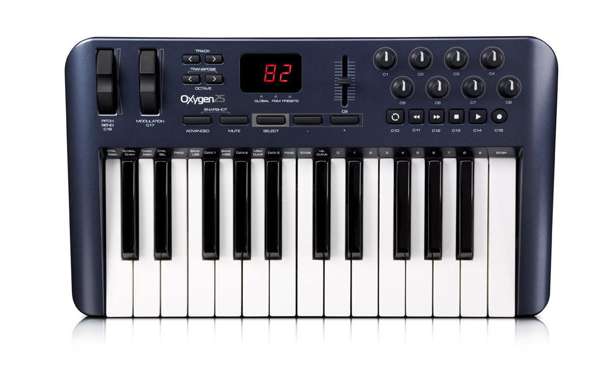 The Oxygen 25 USB MIDI controller delivers next-generation functionality from M-Audio®, the leading innovator in mobile music production technology. The Oxygen 25 features eight assignable knobs, plus dedicated transport and track select buttons. DirectLink mode automatically maps these controls to common DAW functions* including transport, mixer, track pan and plug-in parameters. Built-in factory presets offer support for popular virtual instruments right out of the box—no complicated setup required. Velocity-sensitive keys and a sleek, compact design round out a portable keyboard that’s perfect for laptop production, live DJ performance, triggering samples or composing on the go. No other MIDI controller in this price range has so much functionality while remaining easy to use.