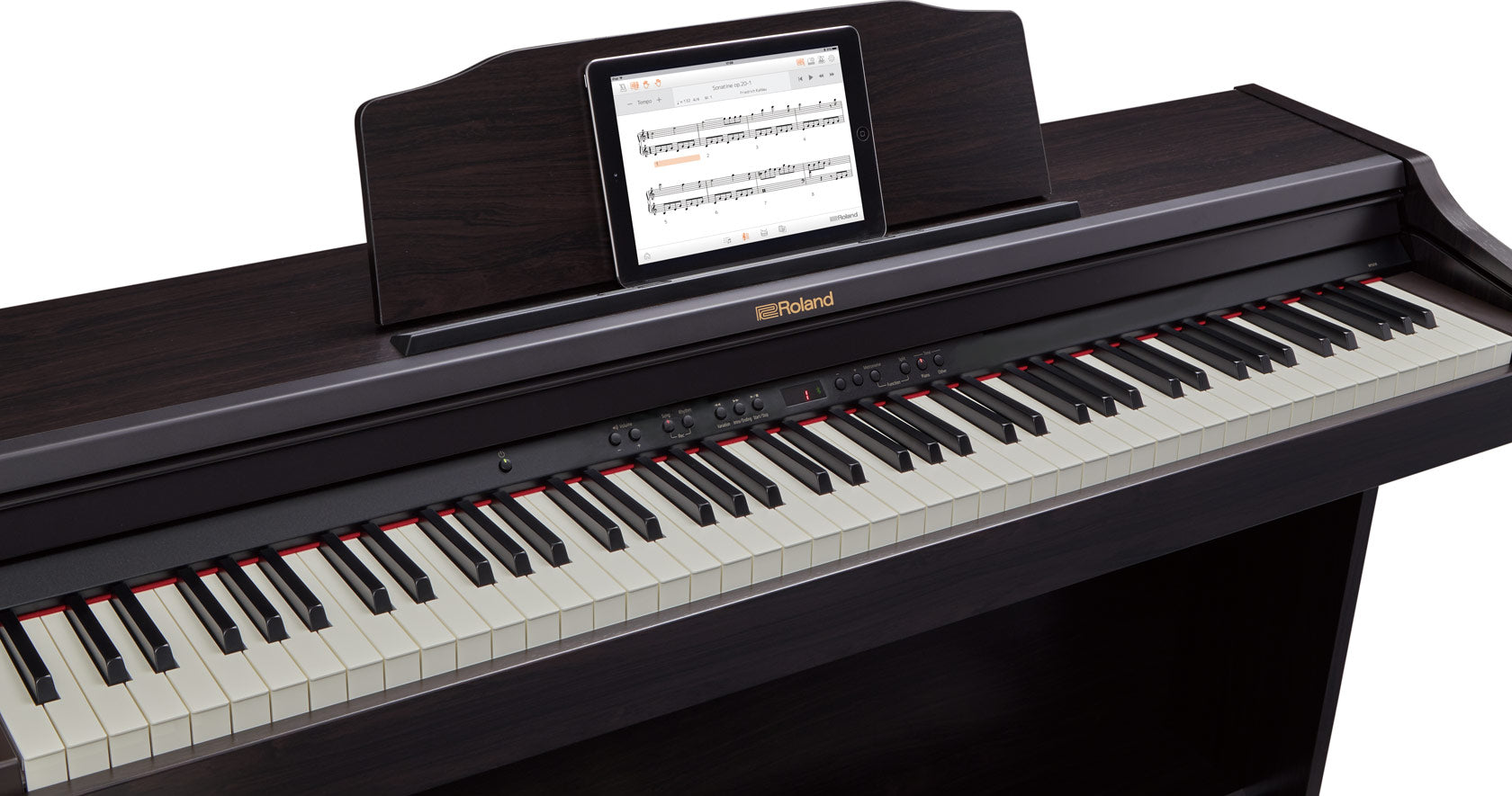 Kick-Start Your Piano Journey with Practice-Friendly FeaturesIt can be hard to stay engaged when you’re learning piano, but the Roland RP501R is full of additional features that make practice a pleasure. An onboard metronome improves your sense of timing before you assess your progress with the onboard recorder. Audio and MIDI playback (from USB memory) lets you jam along with your favorite songs as they play through the piano’s speakers, while Twin Piano mode avoids the grind of solitary practice, allowing you to play in the same key range side-by-side with a duet partner or teacher. If there’s a song you want to learn, download it to your tablet from Sheet Music Direct, or install the piaScore app for free access to 70,000+ classical music scores. By pressing the piano’s pedal, you can even turn the pages of the score on your tablet’s screen. |