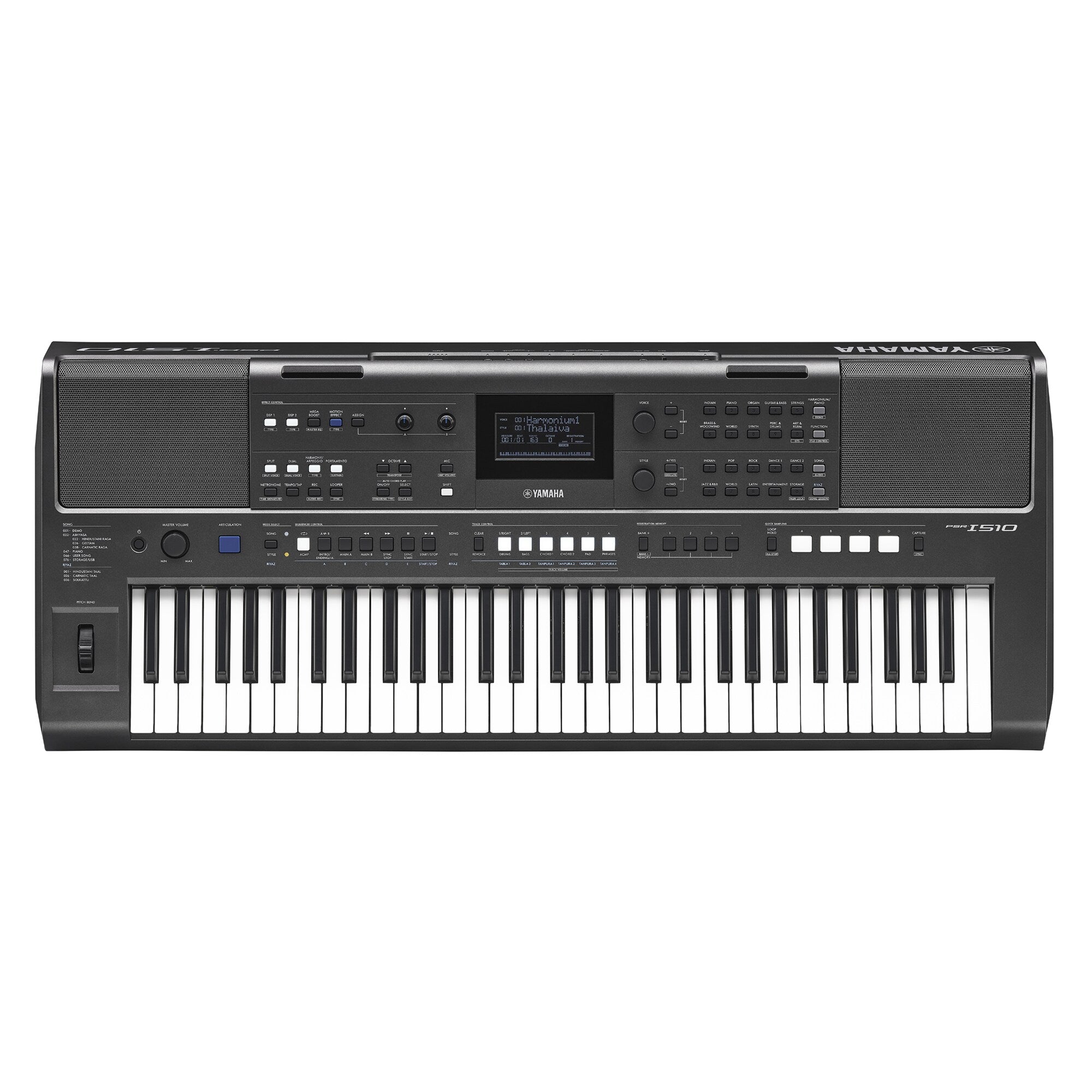 The PSR-I510 contains 40 Indian instrument Voices and 60 Indian Styles (auto-accompaniments), covering a diverse range of Indian music. In addition to Indian sounds, this single unit features Voices for a variety of instruments such as piano, guitar, and drums.